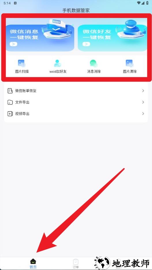 1. 在底部点击首页按钮,进入主界面,选择需要的数据管理或恢复功能。