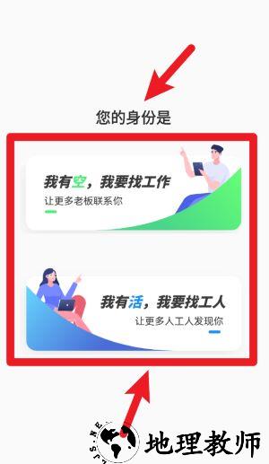 1、打开应用后,首先选择我是找工作或我是找工人,明确身份后进入对应操作页面。