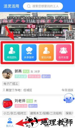 2、若选择找工人身份,可通过首页寻找团队、共享厨师等模块快速进入目标功能区域。