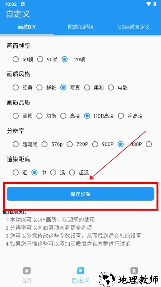 2、进入页面后,按需选择画质帧率、画质风格、画质品质、分辨率、渲染距离,选定后点击 “保存设置”。