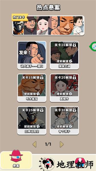 9、点击左下角的悬案,可以游玩通关关卡解锁的热点悬案。
