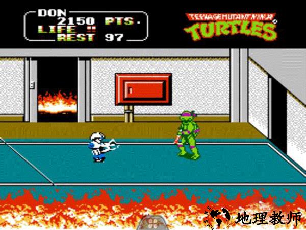 7、过关技巧:可以站在boss旁边然后使用普通攻击,boss在被攻击时不会攻击忍者龟,不过要注意躲避boss的子弹,一般失去两条性命就可以过关了。