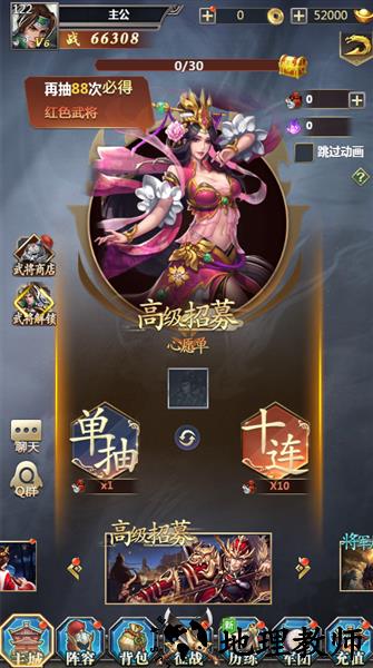 3、玩家每次招募都会赠送一定数量的武魂积分;普通招募可产出武将碎片;高级招募、将军府每次招募必定获得紫色以上的武将,高级招募中,每88次招募必定获得红色武将;将军府中,每30次招募必定获得选定国家的红色武将;将魂殿可产出武将将魂,可用于将魂录。