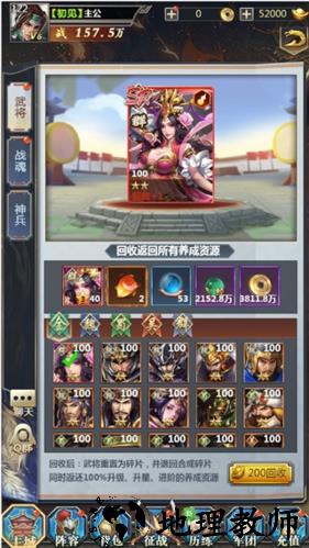 5、武将回收可分解武将,返还所有养成资源及武将碎片。