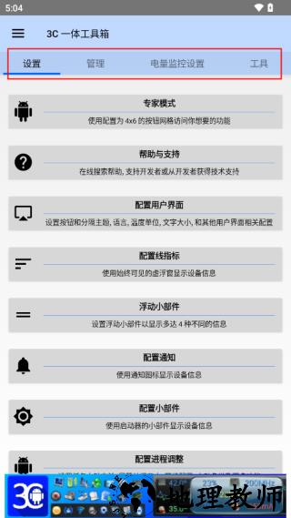 1、进入 3C 一体工具箱 App,可看到 “设置、管理、电量、工具” 四大板块,每个板块下均含多个功能;