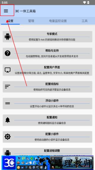 2、在 App 主页左上方,找到并点击三条横杠图标,进入更多功能查看界面;