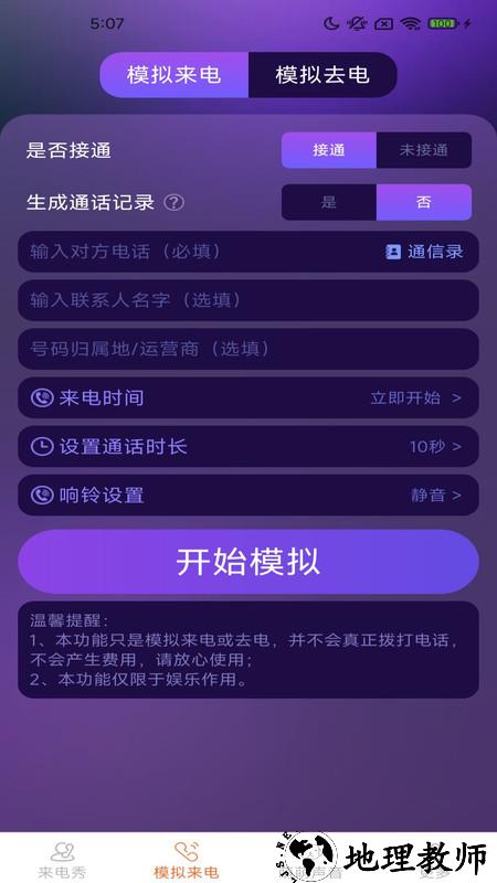 1、模拟来电场景:支持自定义来电显示号码与姓名,可真实模拟通话场景。
