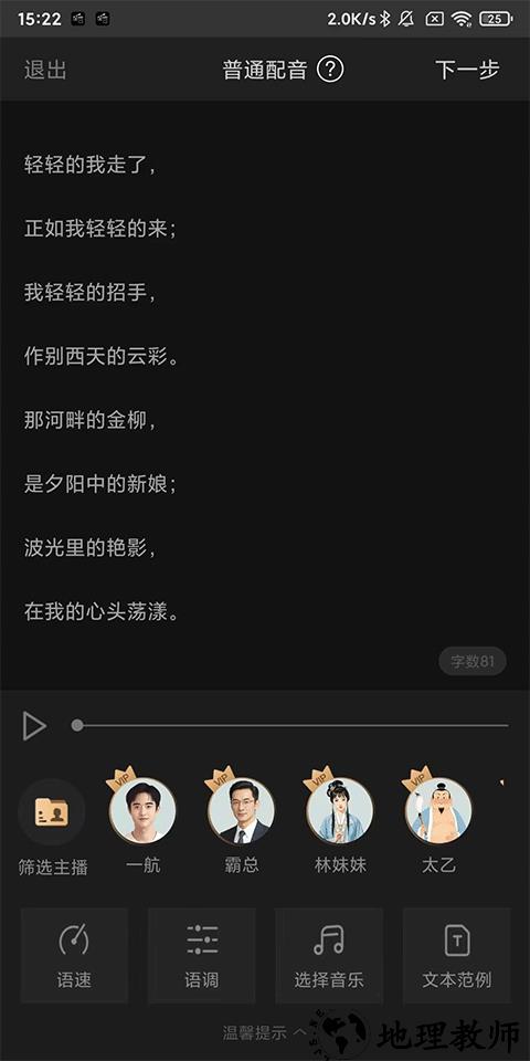 3、文案丰富:拥有海量样音模板文案与优质背景音库,可实现文案与音效完美搭配;