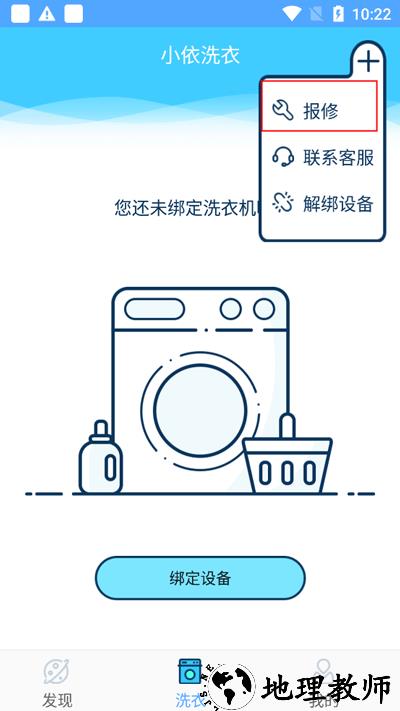 3、报修方式第二步:在 “洗衣” 页面右上角点击 “+” 号图标,在弹出的选项中选择 “报修”;