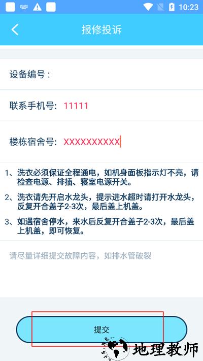 4、报修方式第三步:在报修页面填写洗衣机故障相关问题,确认信息无误后提交,等待维修人员处理。