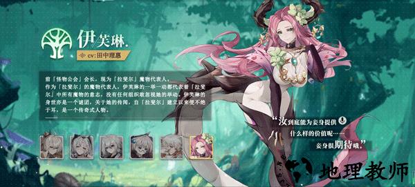 前怪物公会会长,现为拉斐尔魔物代表人。作为拉斐尔的魔物代表人,伊芙琳的一举一动都代表着拉斐尔中所有魔物的意志,没有任何组织敢忽视她的举动。伊芙琳的身世亦是一个谜团,关于她的传闻,自拉斐尔建立以来便不绝于耳,是一个传奇式人物。