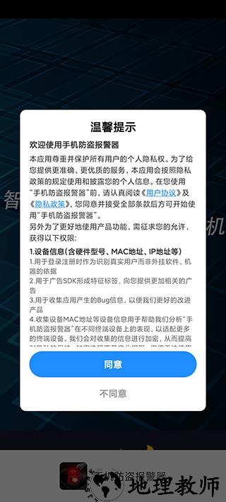 1、下载安装手机防盗报警器语音版,首次进入需同意相关协议。