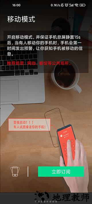 4、移动模式适合公共场所使用,手机被随意移动即触发报警。