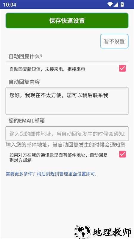 1、支持依据短信内容、来电触发自动回复,也可设置自动回复所有短信与来电。
