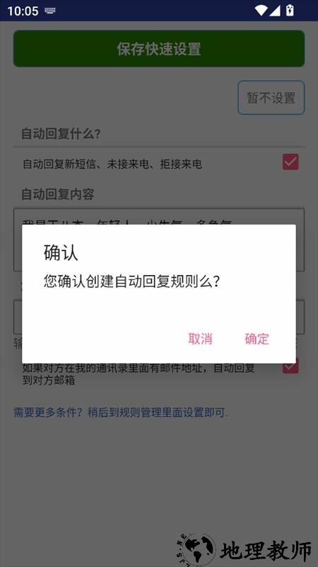 3、支持按时间段与号码来源进行设置,实现选择性自动回复,避免无效回复。