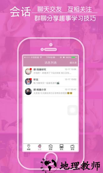 4. 会话:提供聊天交友功能,用户可以相互关注,群聊分享趣事,学习技巧。