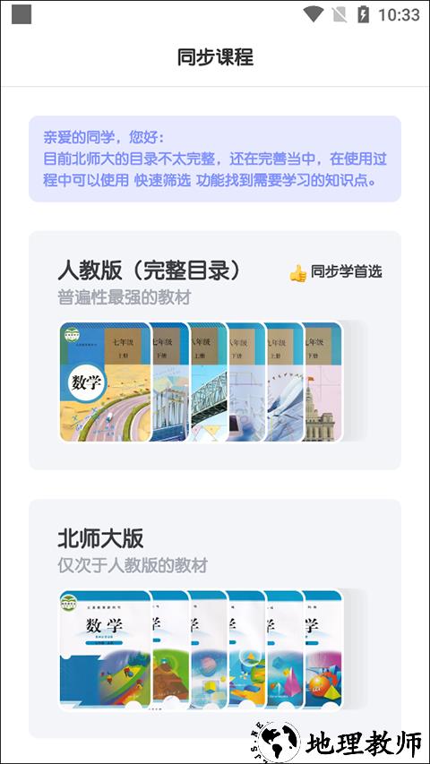 2、软件提供同步课程资源,需注意北大师大版目录暂未完善,可通过 “快速筛选” 功能精准定位核心知识点;