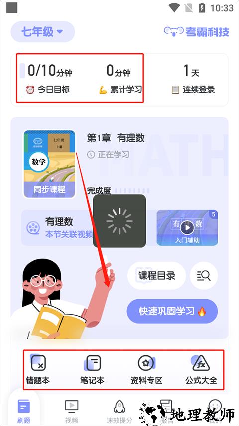 4、进入学习界面后,可自主设定学习目标,同时包含错题本、笔记本、资料专区、公式大全等实用工具。