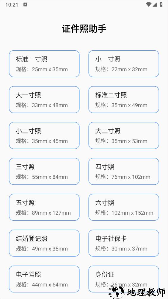 1、启动证件照助手 APP,在首页选择所需的证件照尺寸规格;