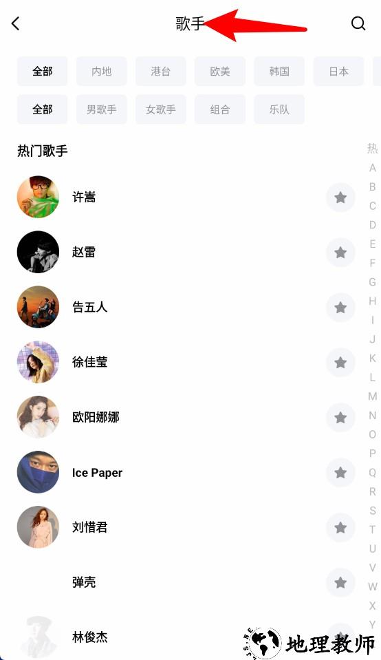 3、在歌手栏目中可查看内地、欧美、日韩等分类歌手及个人代表作品。