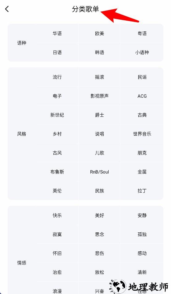 2、点击分类歌单可按语言、风格或情感筛选歌曲,快速定位喜好类型。