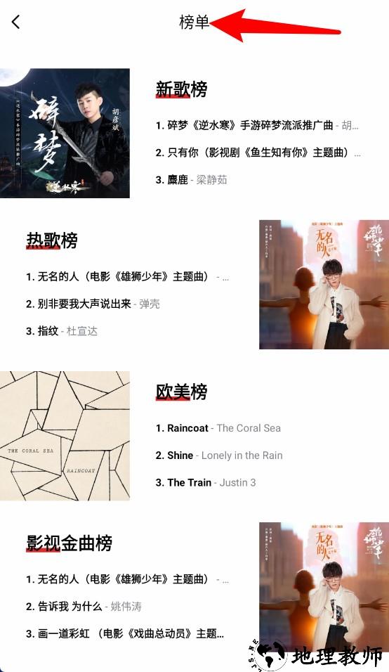 4、进入榜单页面可查看新歌榜、热歌榜、影视金曲榜等当前热门音乐排行。