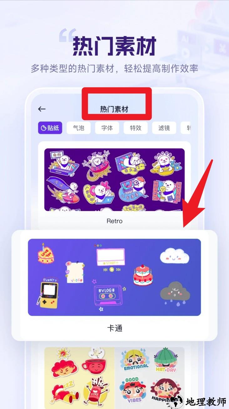 1. 在首页点击热门素材,选择贴纸、气泡、字体等分类,即可套用多款风格素材进行视频创作。