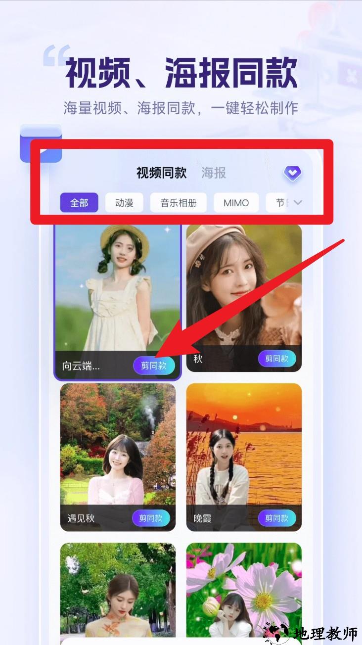 2. 进入视频同款版块,点击喜欢的模板,可一键导入视频与图片内容,生成高质量作品。