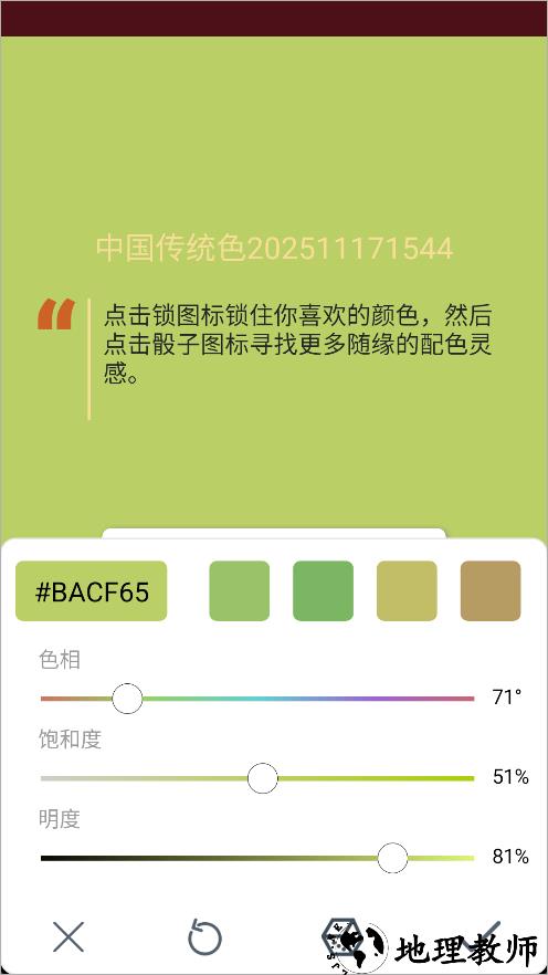 3、取色的界面独创锁定与随机取色机制,降低配色搭配难度,轻松调出好看效果。