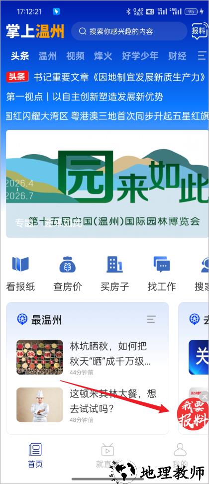 1、打开掌上温州客户端,在首页界面中找到并点击【报料】入口,进入报料流程。