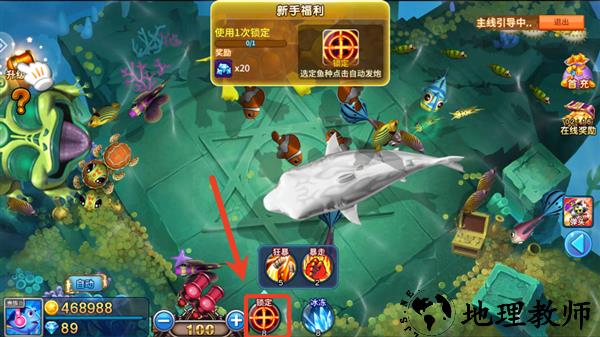 2、使用下方技能[锁定]可以自动选中鱼种进行自动发泡。