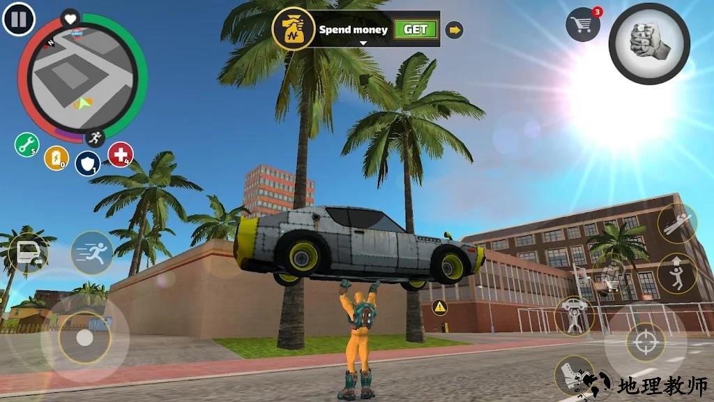 1、绳索英雄副镇中的图标和按钮功能,左边从上到下可以看到地图、奔跑、移动等按钮,右半从上到下分别是显示能量、血量、上车、跳跃、绳索、攻击、脚踢,除此之外用手指滑动屏幕还可以控制视角。