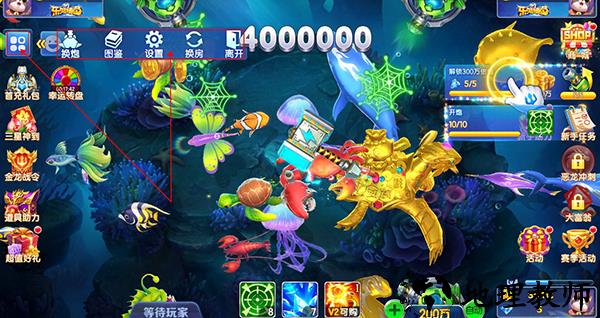 点击左上角的四个口,打开“更多页面”,可以使用炮台切换、游戏设置、查看图鉴、切换捕鱼房间、离开房间五个功能。