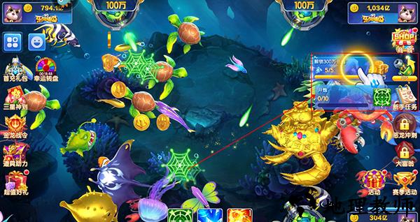2、【高倍 BOSS 畅爽爆金】:独创海怪渔场,打造机械蟹王、万年巨鳄、深海鮟鱇、史前海怪等超炫场景,蟹王、巨鳄、鮟鱇、史前章鱼等高倍 BOSS 盘踞海底,让玩家尽享别样捕鱼快感。