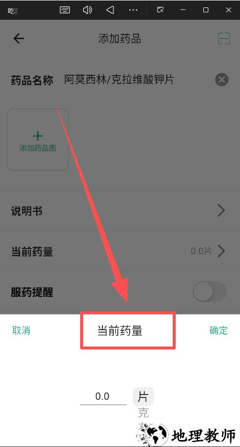 用户还可以设置药品的当前存量,当药品数量低于设定值时,系统会自动发出采购提醒。这项功能也可以在"家庭药箱"模块中使用,方便用户统一管理所有常用药品。完成所有设置后,点击确认按钮即可保存该药品的全部设置信息。