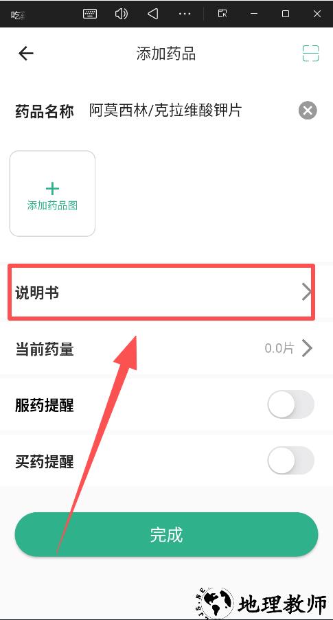 5、用户还可以设置药品的存量和提醒买药的时机,这些功能也可以在家庭药箱使用,方便用户对常用药品进行提醒设置,点击完成按钮完成药品设置。