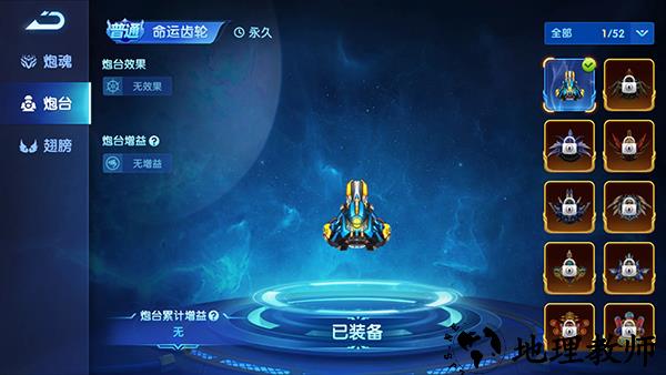 点击左上方的三角形打开“更多”页面,选择炮台,即可进入炮台页面,可以查看炮台信息和切换