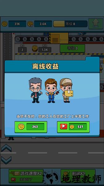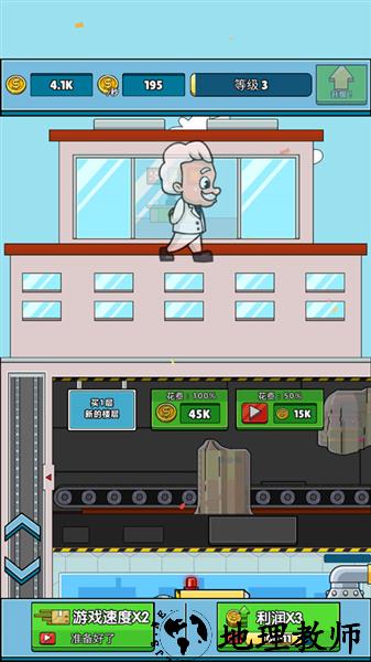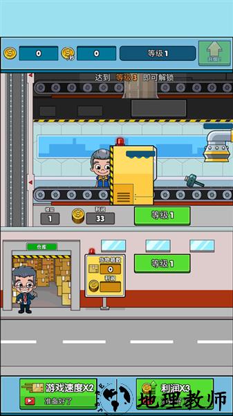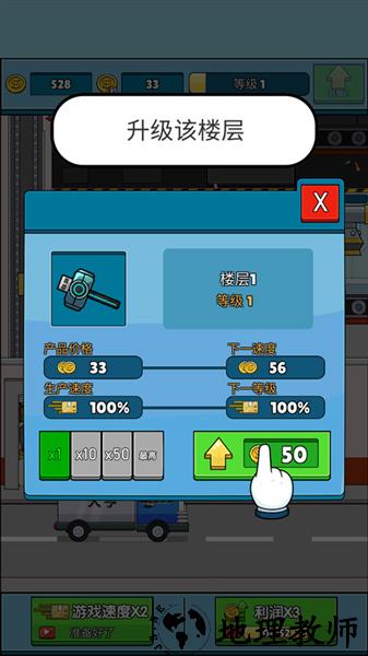 5.生产流程与游戏进度全程自动运行,需在金钱达标后,升级楼层及工人的生产速度即可。