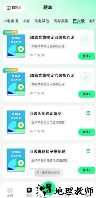 2、进入题库页面可查看多个学习功能,选择 “四六级” 板块进入。