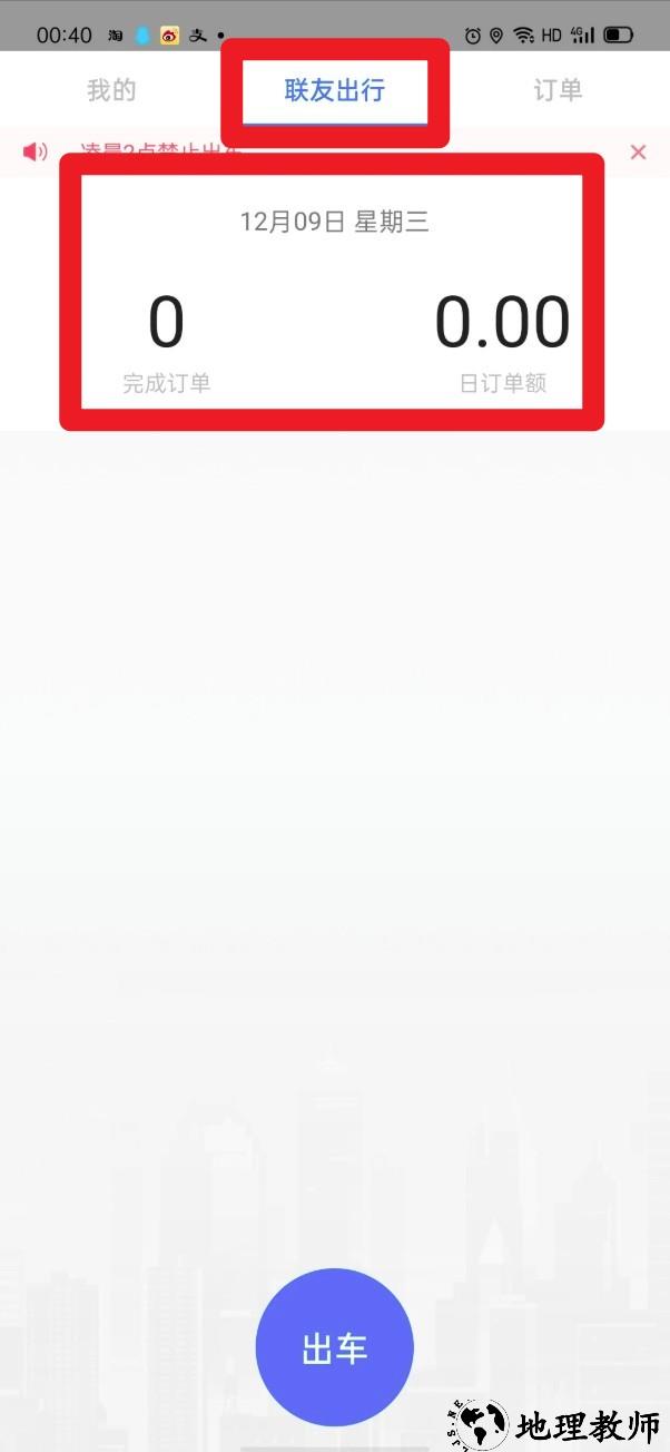 2. 登录后进入联友出行主页面,可查看当天已完成订单数量及对应总金额,方便快速掌握日常运营情况。