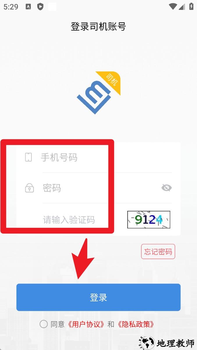 1. 打开APP后,输入手机号、密码及验证码,然后点击登录按钮。请务必勾选下方的《用户协议》。