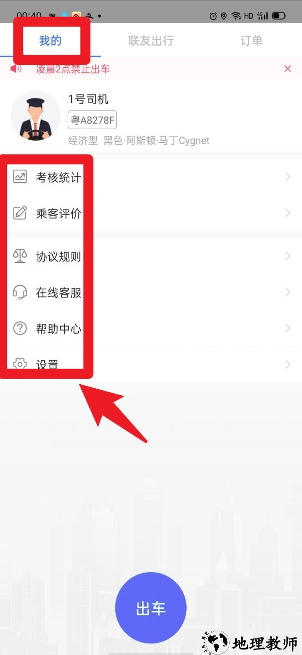 4. 点击我的标签页,进入个人中心,可查看司机信息、考核统计、乘客评价,可进入设置或联系客服获取帮助。