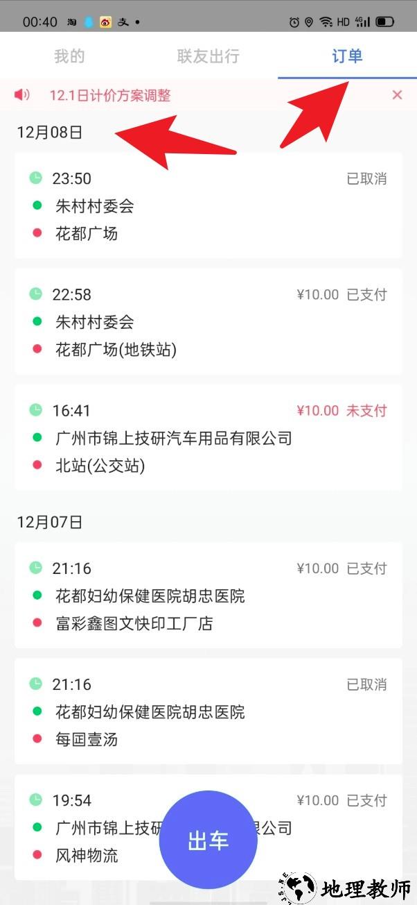 3. 点击上方订单标签,可以查看过去几天的行程记录,包括起点、终点、时间、费用及支付状态,便于核对账务。