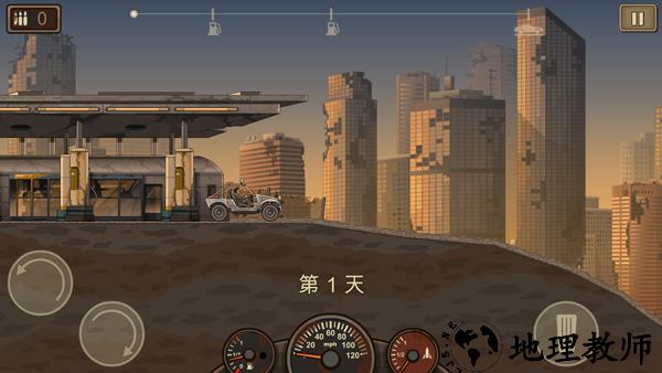 这是一款末日逃亡的跑酷游戏,游戏目标简单明了就是一路向前,越过障碍物和僵尸,不过战车基本上都是撞过去的,我相信不少人都会觉得把僵尸撞得肉末飞溅是这款游戏的非常刺激的画面。游戏的界面和操作也是很简单的,这非常适合新玩家上手。进入游戏界面后,在屏幕的左下角是调节战车重心的两个按键,在中部是战车的仪表,上面显示时速、油量和推进器的燃料量,在最右侧是油门,在战车升级加装推进器后会有一个推进器的油门按钮出现。通过游戏中战车达到的距离获得金币来购买或升级战车的配件,已使战车能够达到更远的地方,直至到游戏关卡的终点,在通过一个关卡后会获得更强大的战车,来应对之后更加恶劣和复杂的道路。