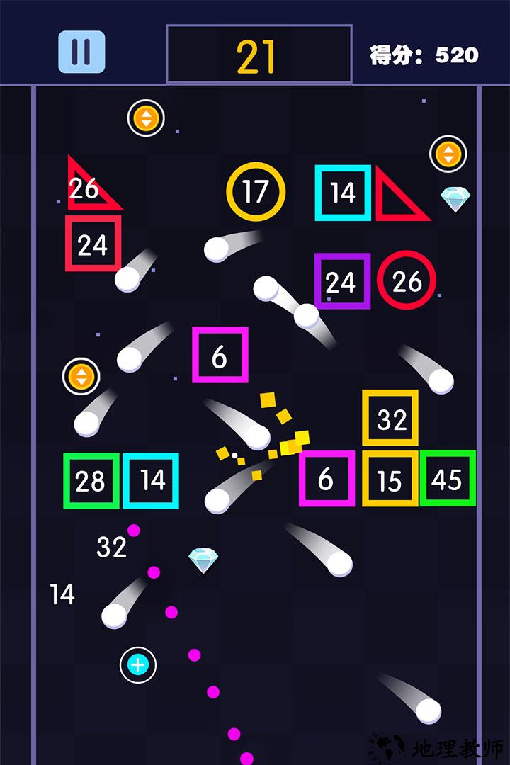 2、利用弹珠以合理的角度消除不断下降的数字方块。