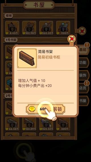 2、点击“书屋”,在这里建造基础设施,先购置一个简易书架。通常客人进店,会在书架寻找他想要的书籍。客人的想法总是很多,如果他们找不到书籍,可是会生气的。
