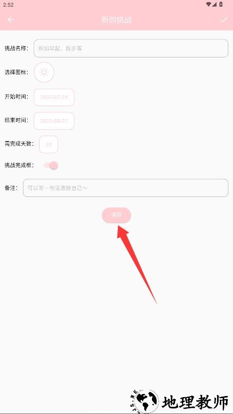 4、填写挑战名称信息、时间周期范围及目标天数要求,添加备注说明后保存完成创建流程。