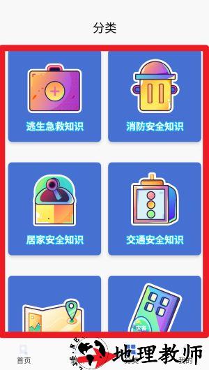 4、点击底部分类图标,按照不同安全类型浏览课程内容,系统学习逃生、消防、交通等安全知识。