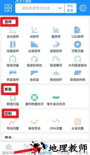 3、通过高级功能菜单进入放样、断面与控制功能页面,根据施工需求选择对应项目并开展测量作业。