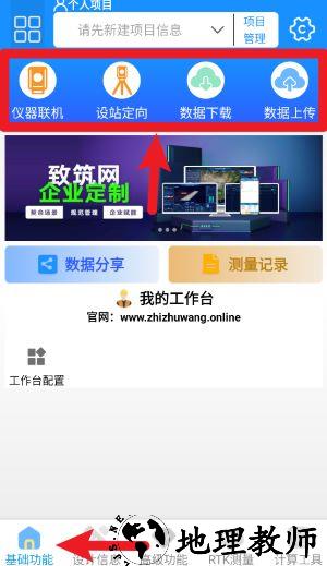 1、打开APP,点击页面下方基础功能按钮,进入后依次完成仪器联机、设站定向、数据下载与数据上传操作流程。